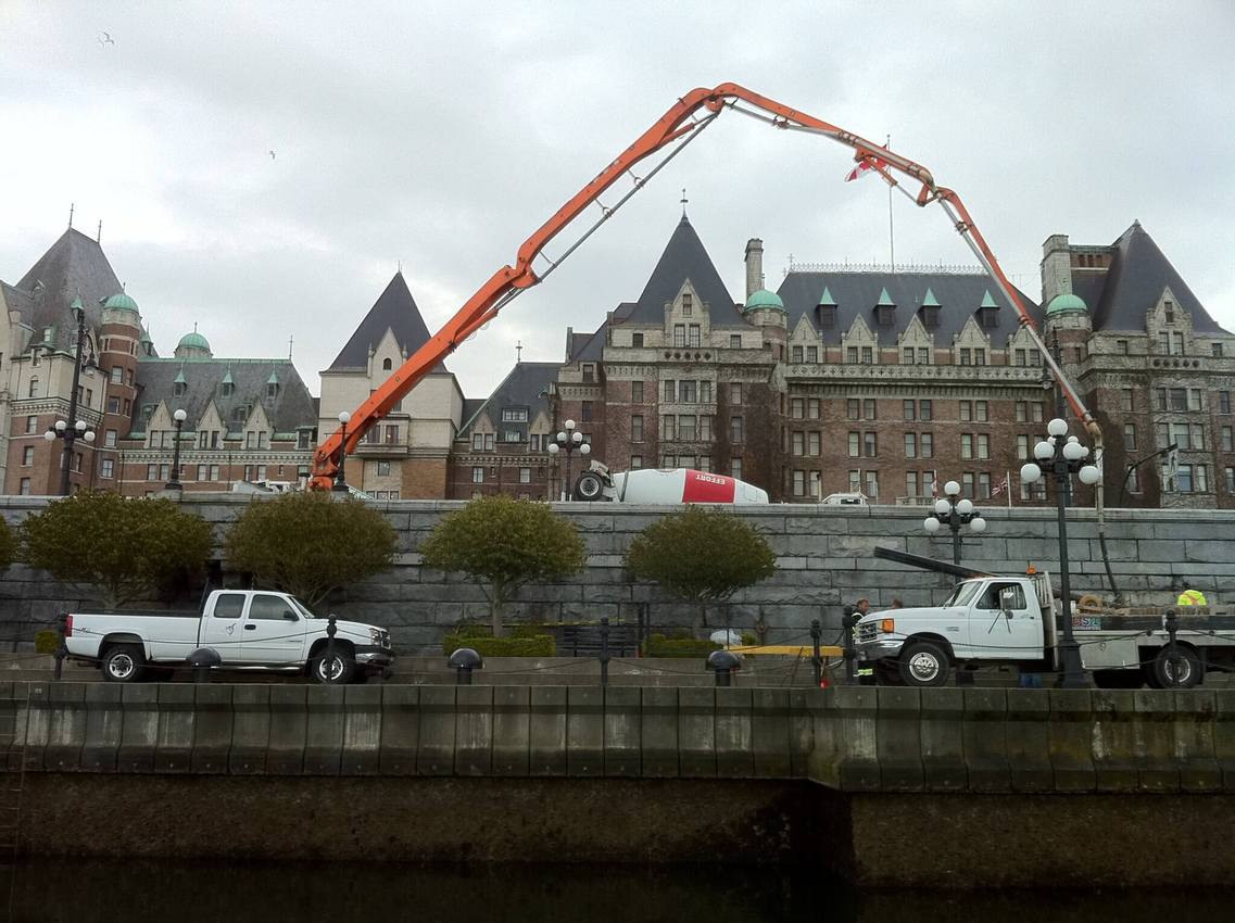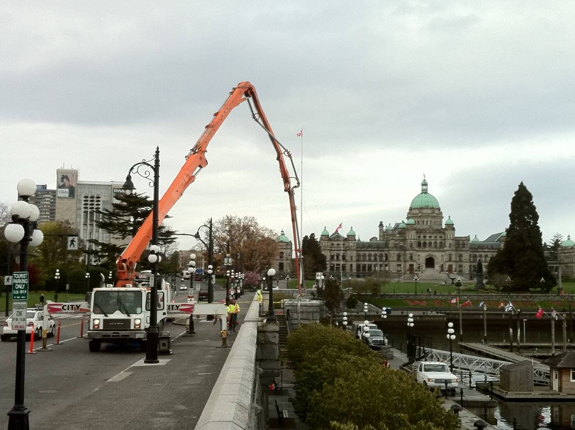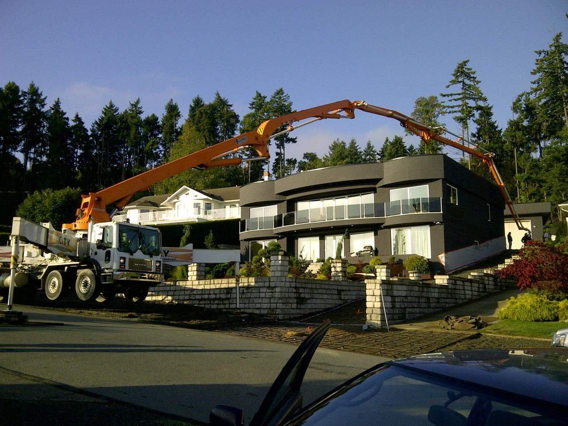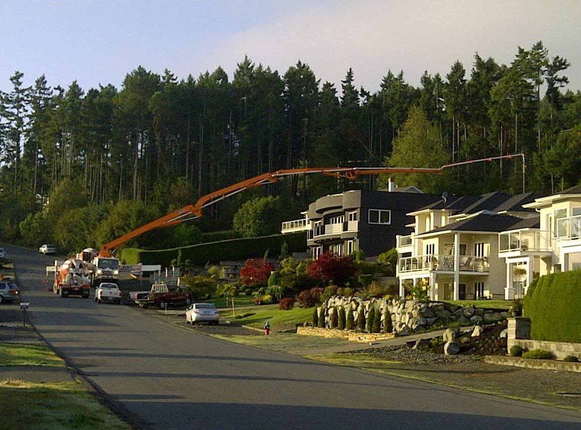 The Jun Jin 50 meter pump is one of our bigger units, perfect for situations that require a high vertical reach or a long horizontal extension. Unit 111 is able to reach over a house in Oak Bay to pour a patio as easily as work a high-rise in downtown Victoria. Pumping services for The Capital Park project in James Bay kept Unit 111 busy for months, including a 15 story tower for The Tapestry on Bellville – ideal work for the 50 meter platform.