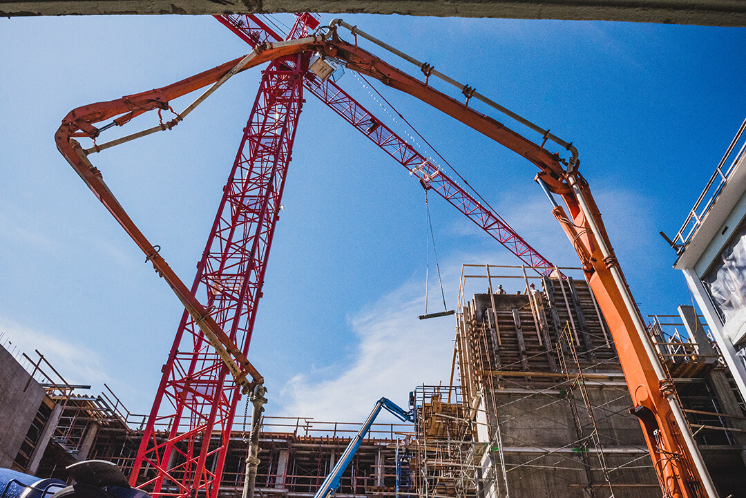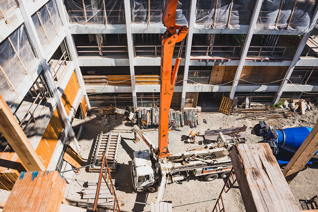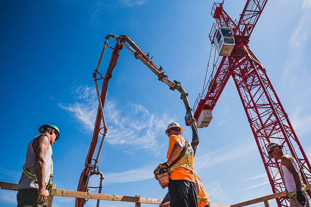 We worked strategically with the developer to deliver concrete in three different ways: lower levels are done by line pump, mid levels done by pumper truck, upper levels done by crane and bucket. A challenging and rewarding project.